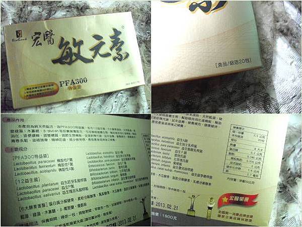 敏元素(紫色箭頭所指的R表示此商標已獲得台灣的專利)是由擁有國家企業品質保證獎的宏醫生技所出品(紅色箭頭所指),產品的功能和製程具有多國專利(橙色箭頭處),不但每個小包裝內菌數高達驚人的300億以上,而且包裝內菌數的活性能維持到2年都很安定喔!此外也投保了1000萬產品責任險(綠色箭頭),讓人食用起來更安心!